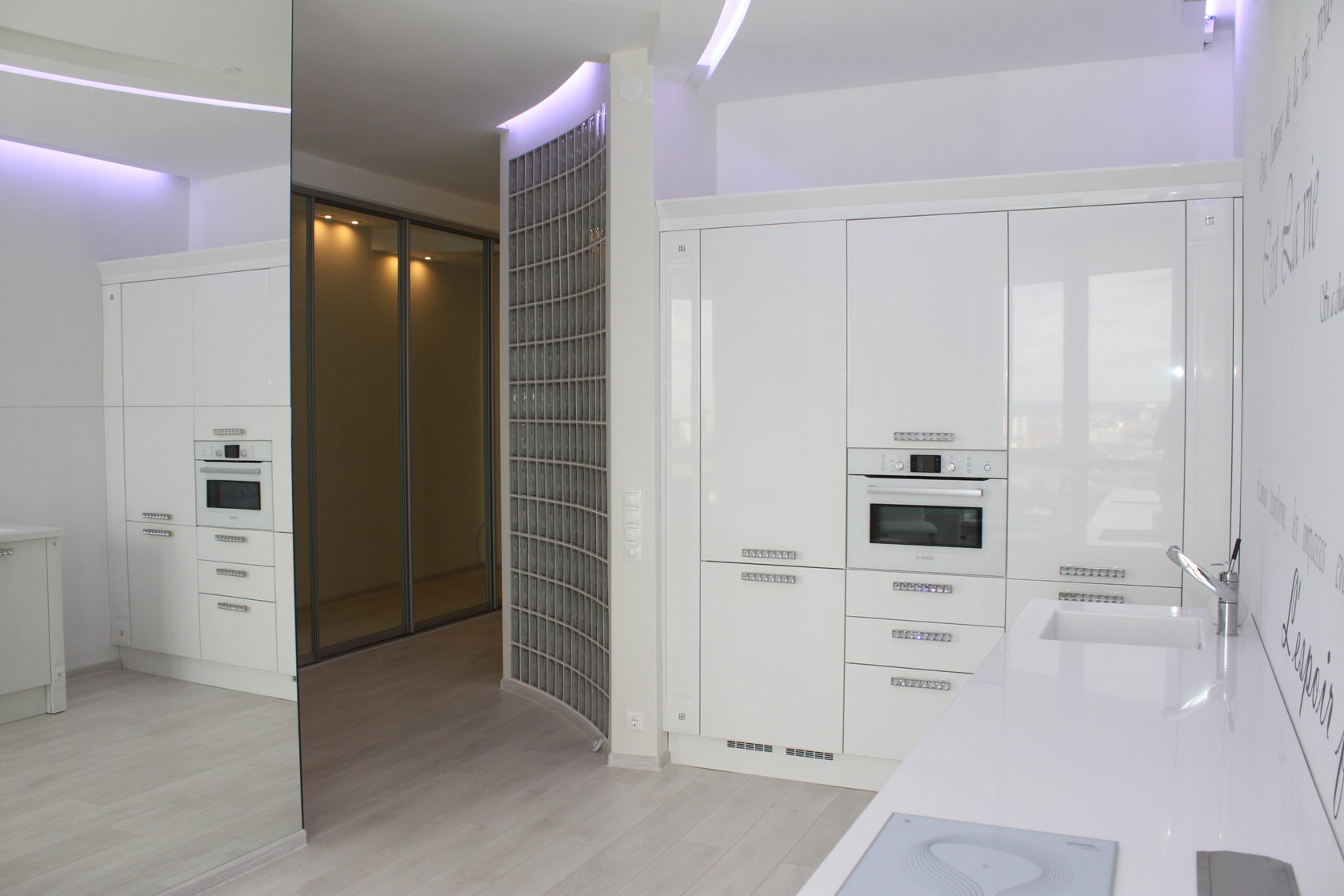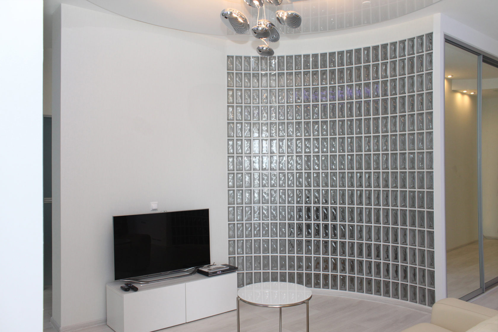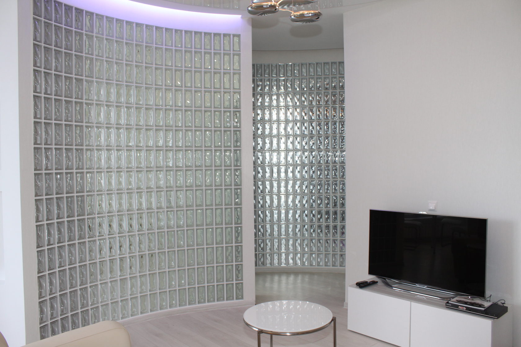 Из этого центра , по радиусу расходятся стены квартиры. Стены выложены из стеклоблоков. Мы