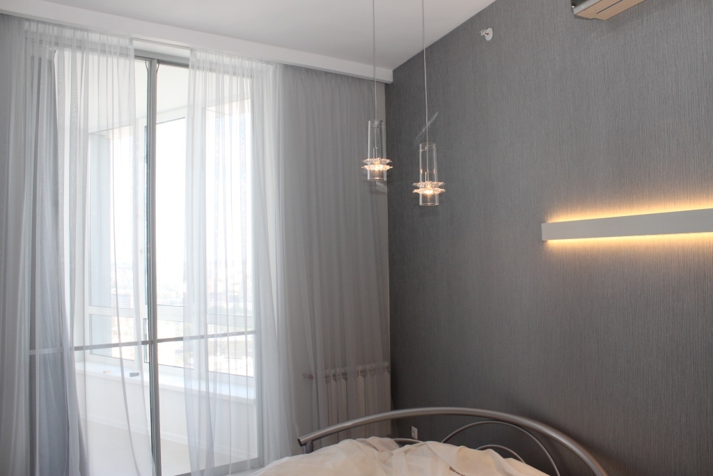 В нишах предусмотрен карниз для штор. Ткань, с мягкой драпировкой придает помещению уют.