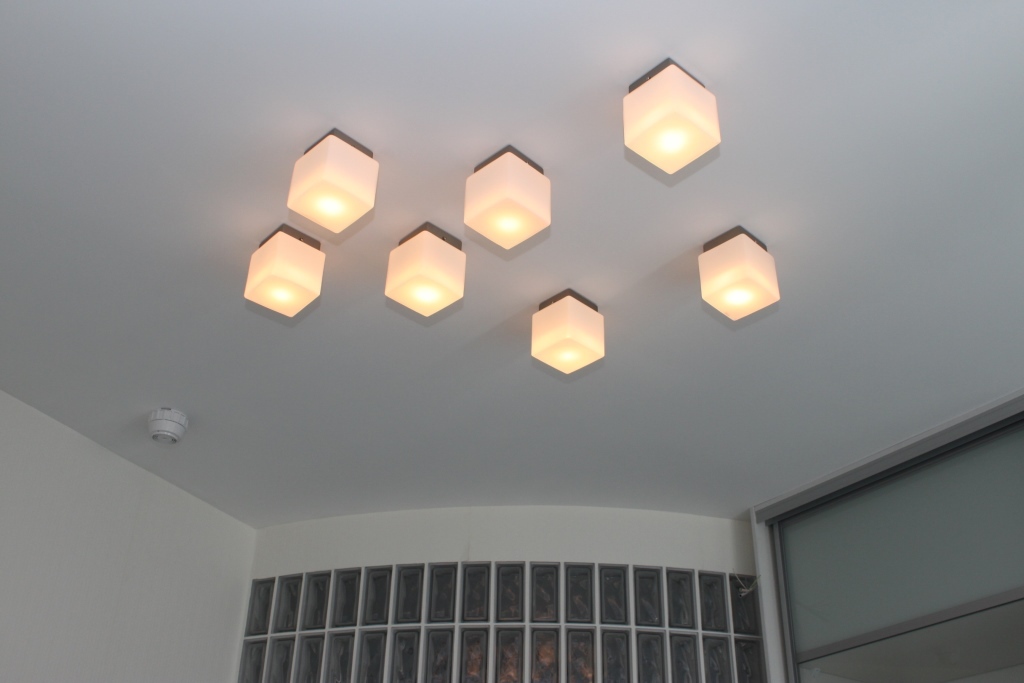 Комнаты имеют не ровную форму. Центра для одной люстры нет. Мы решили купить небольшие кубические светильники и расположить их на потолке хаотично .