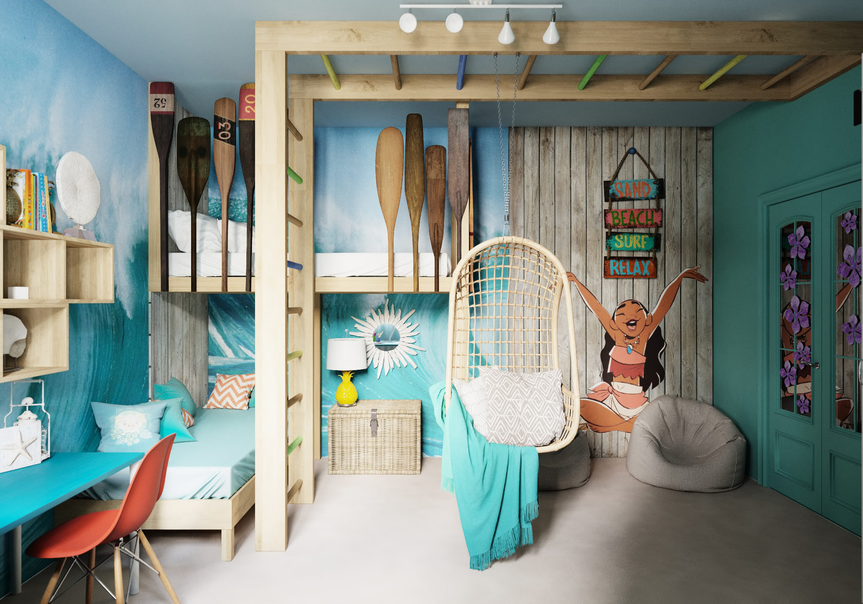 нажере посреди комнаты или о комнате-пляже с песком и шезлонгом,