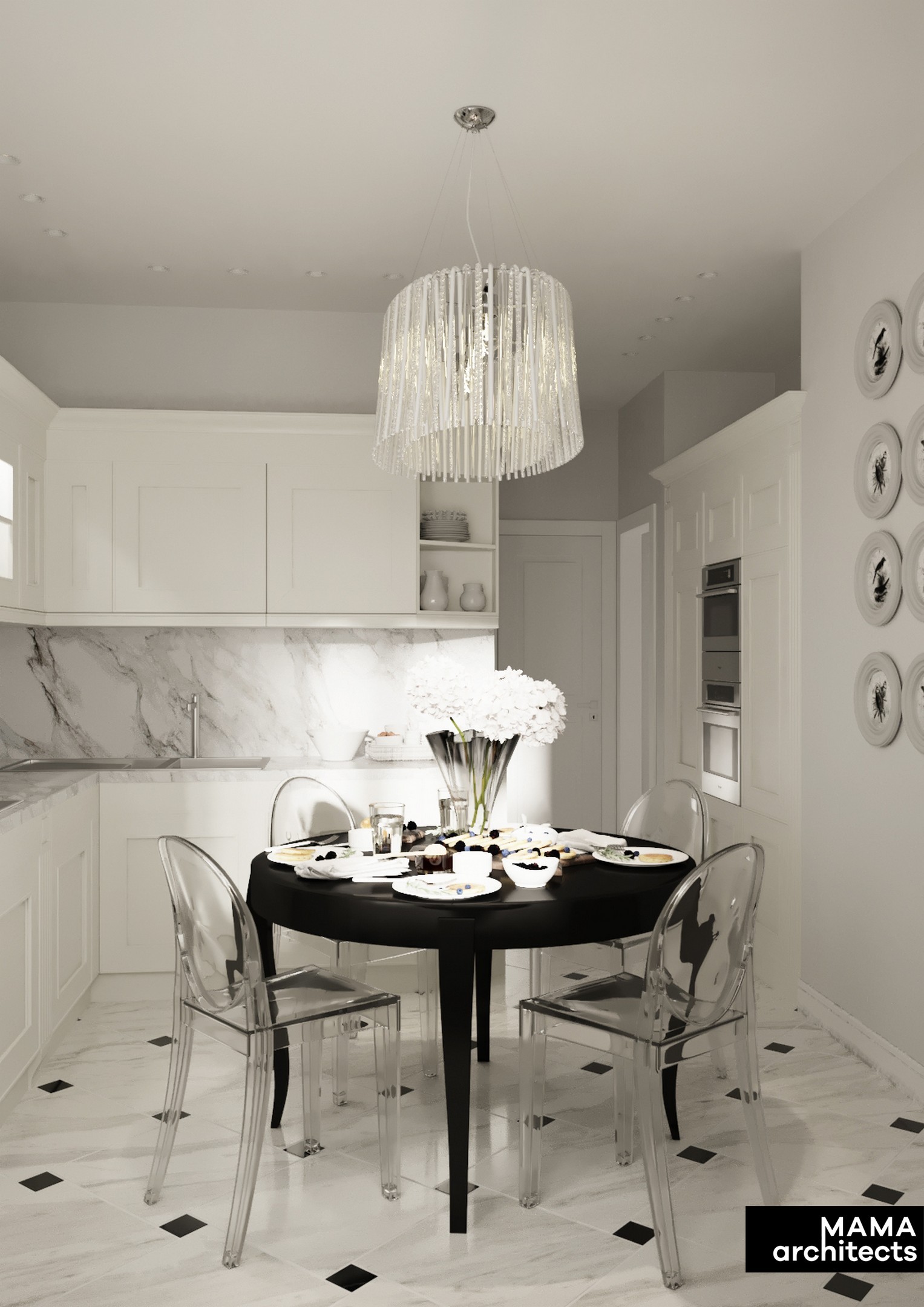 переплетающимися узорами лент, большие арочные зеркала отражают нео-классику в интерьере с тонким